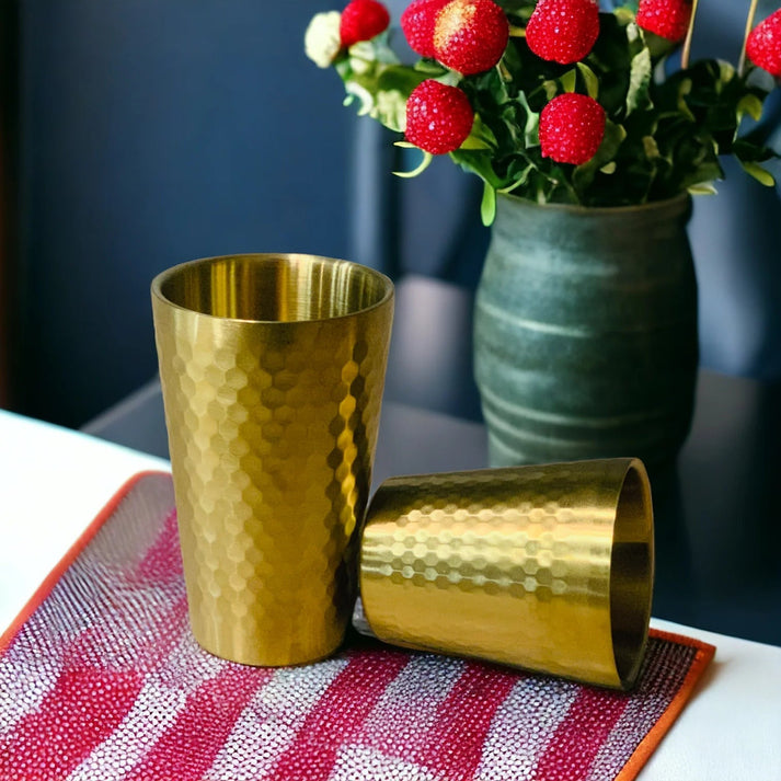 Elevate your drinkware collection with this premium stainless steel glass featuring a distinctive hammered golden finish. Crafted from durable, food-grade stainless steel, it resists corrosion and maintains its lustrous appearance through daily use. The textured hammered surface adds visual sophistication while providing enhanced grip control. Perfect for serving beverages hot or cold, this glass combines aesthetic appeal with practical durability. An ideal choice for those seeking quality barware that complements modern or traditional table settings.